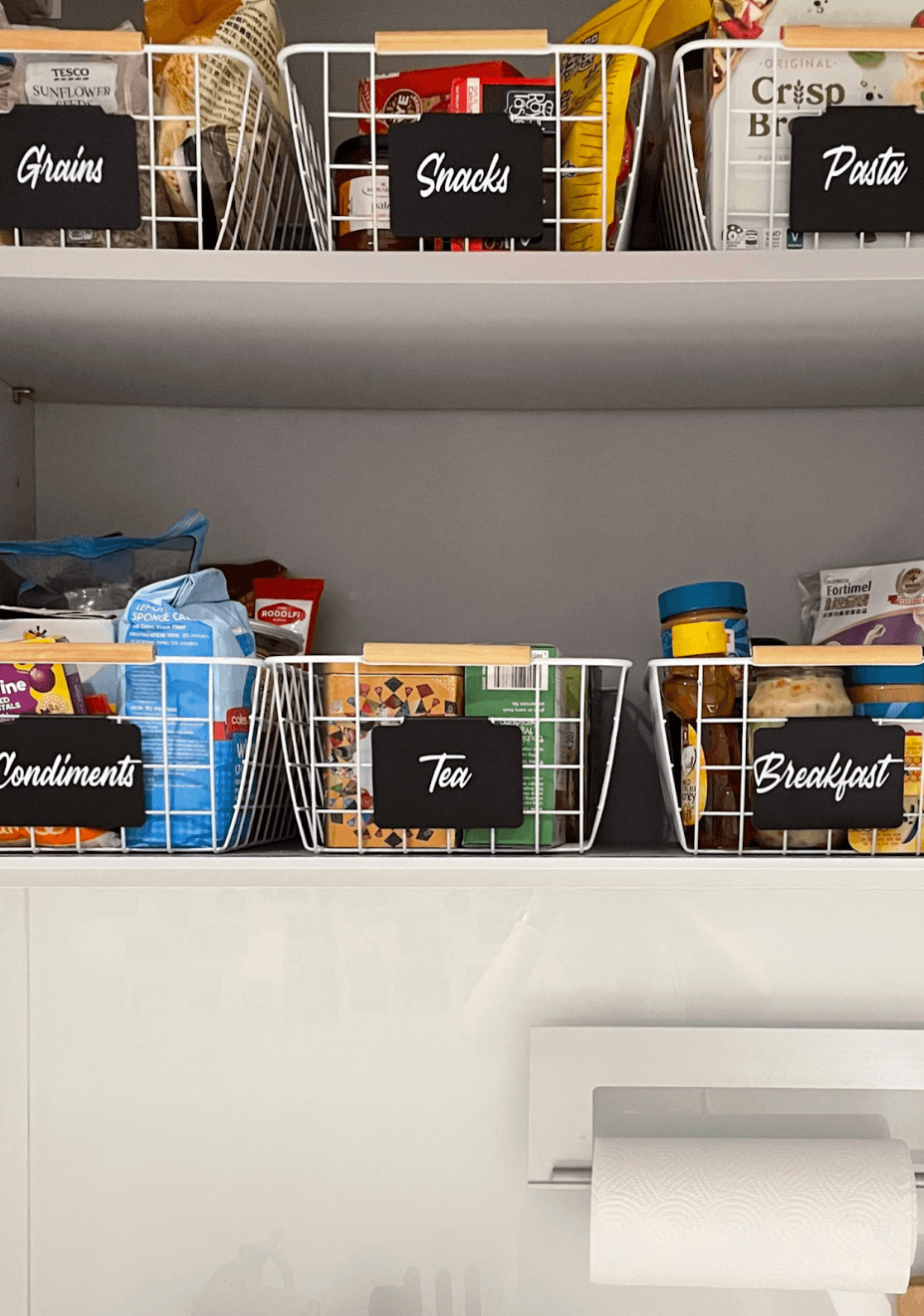 Labels! Labels create clarity on where things should go. No more shoving things where there is available space than forgetting they ever existed.
