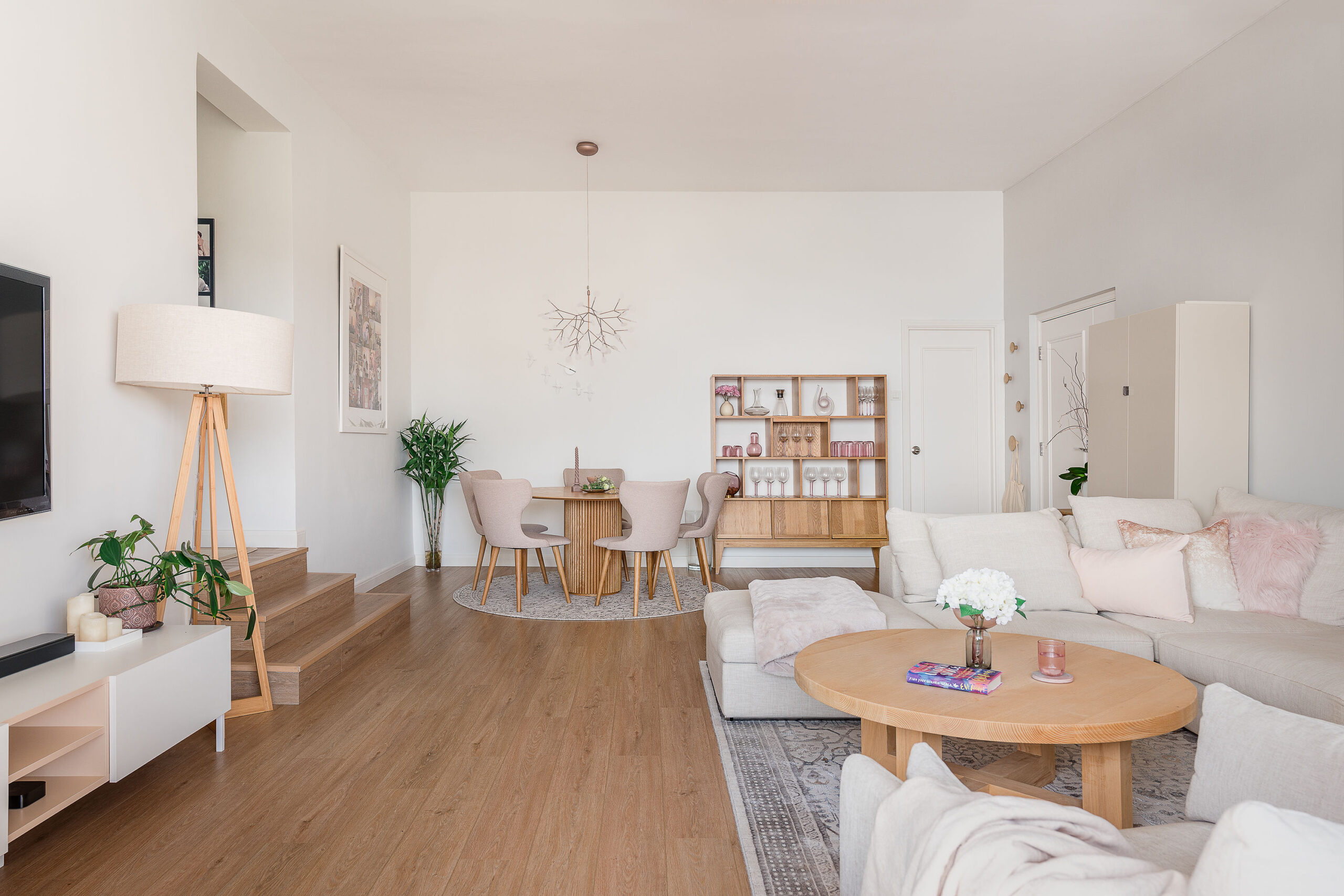 We spruced up the sofa with cream and pink textured cushions to give a warm, fuzzy feeling and placed a chic oriental rug underneath. We wanted to bring warmth to the area, so we chose a natural-wood round coffee table, hung a beachy rattan ceiling light, and added 2 pretty pink prints with marble detailing on the walls. To match the area, we went for a white TV console with light-wood accents and a gorgeous floor lamp with a neutral beige shade, and added the finishing touches of plants and Nordic-style ornaments.