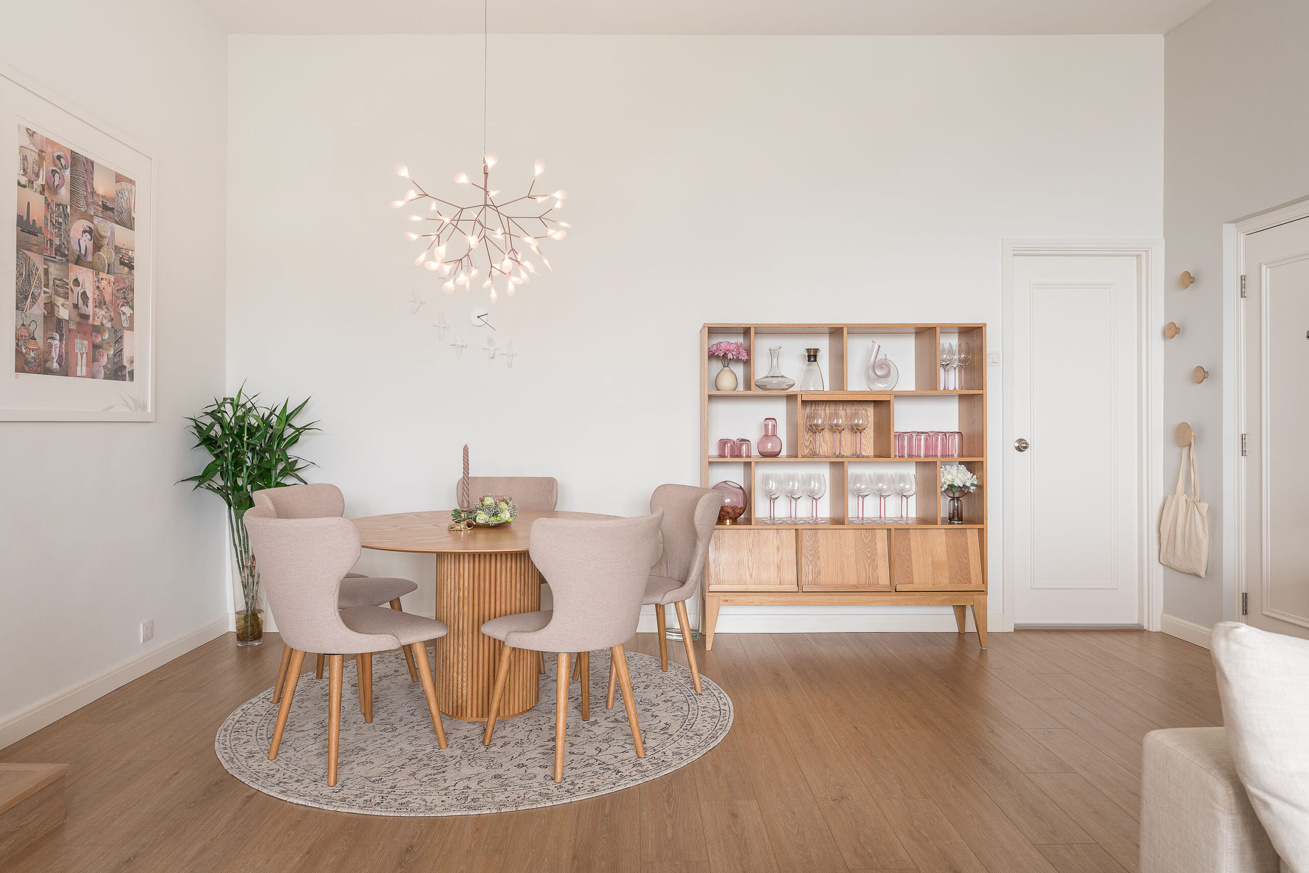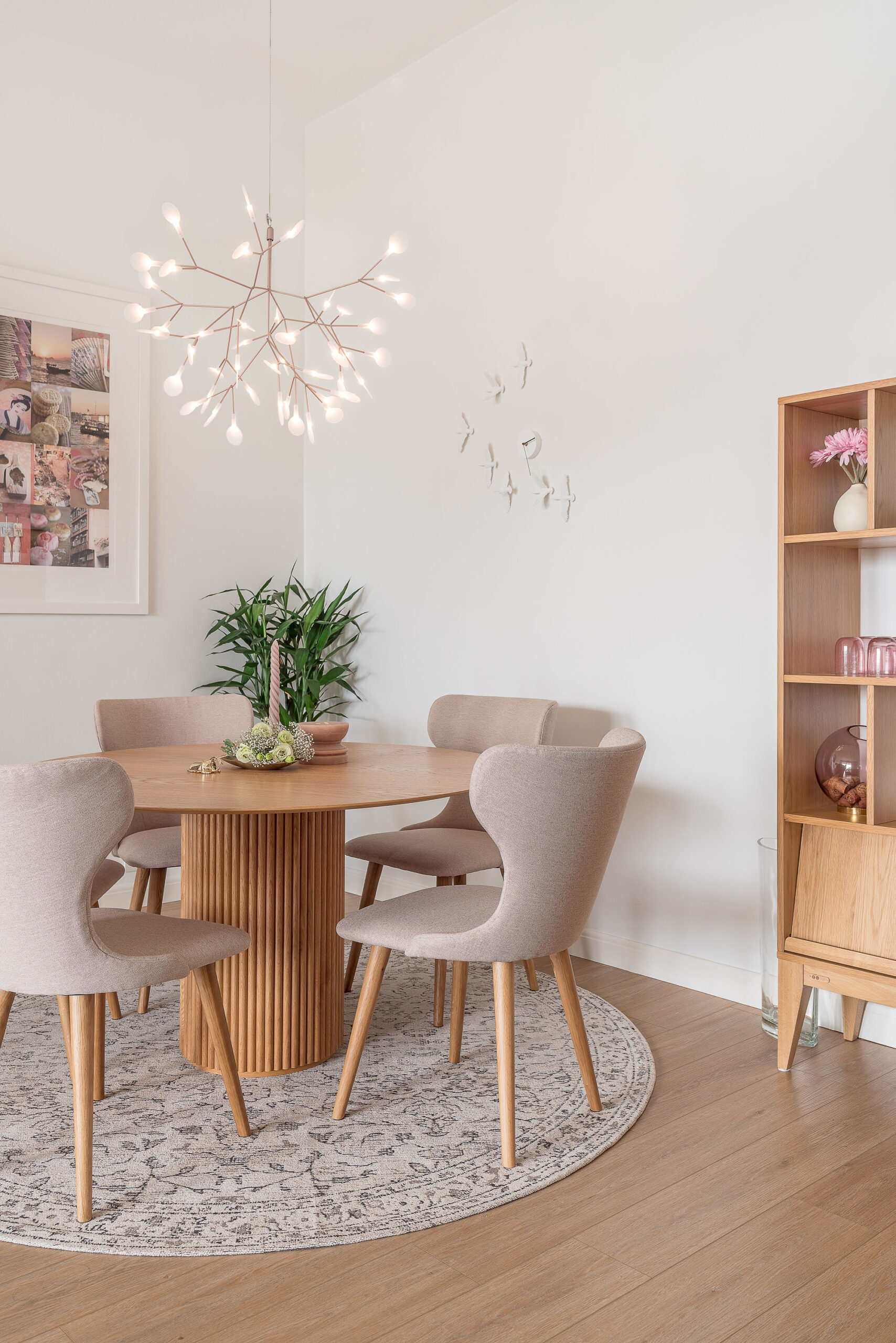 Our favourite part of the room (and Emily’s) was the dining area. Emily loves having her friends over, so choosing a round dining table was perfect for socialising. We paired the wooden table with beige dining chairs and installed an elegant ceiling light above it, adding a floral element to the space.