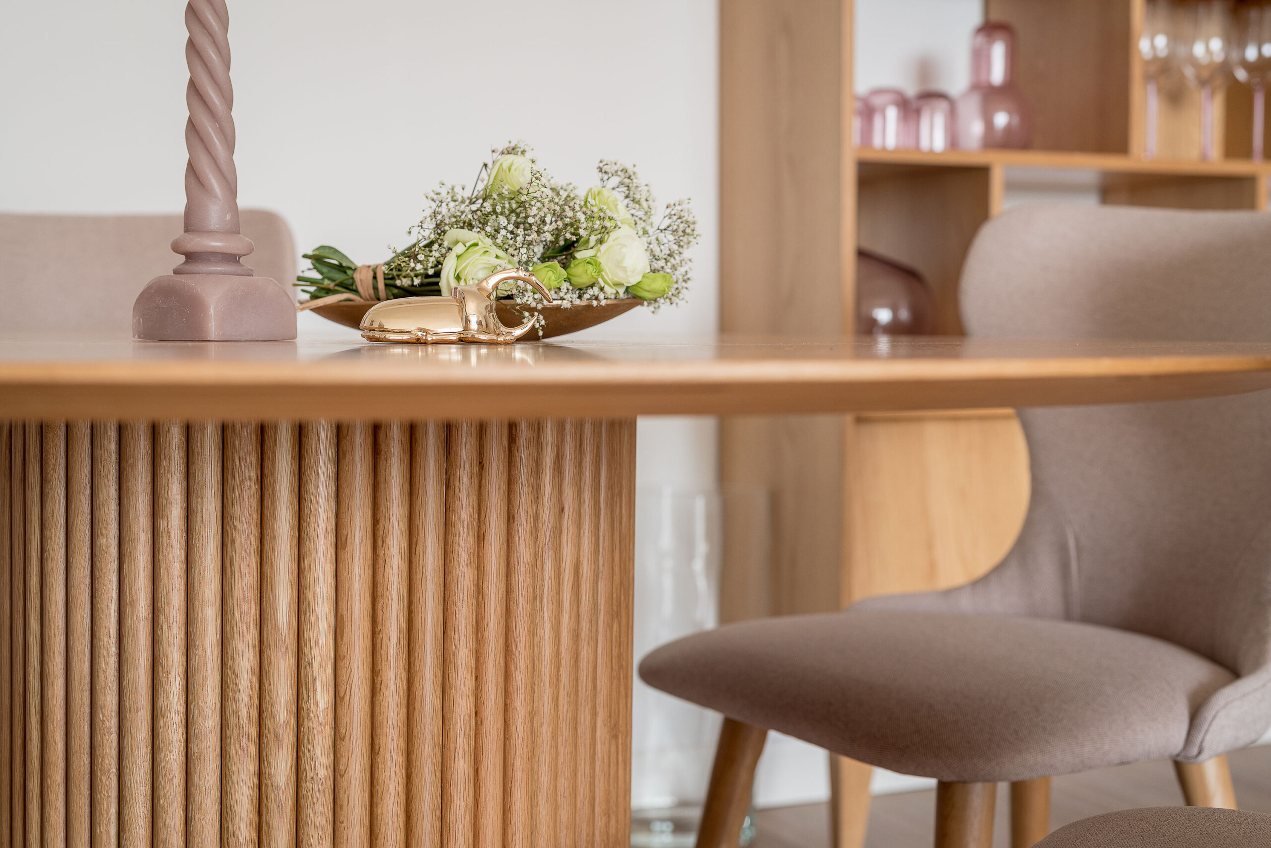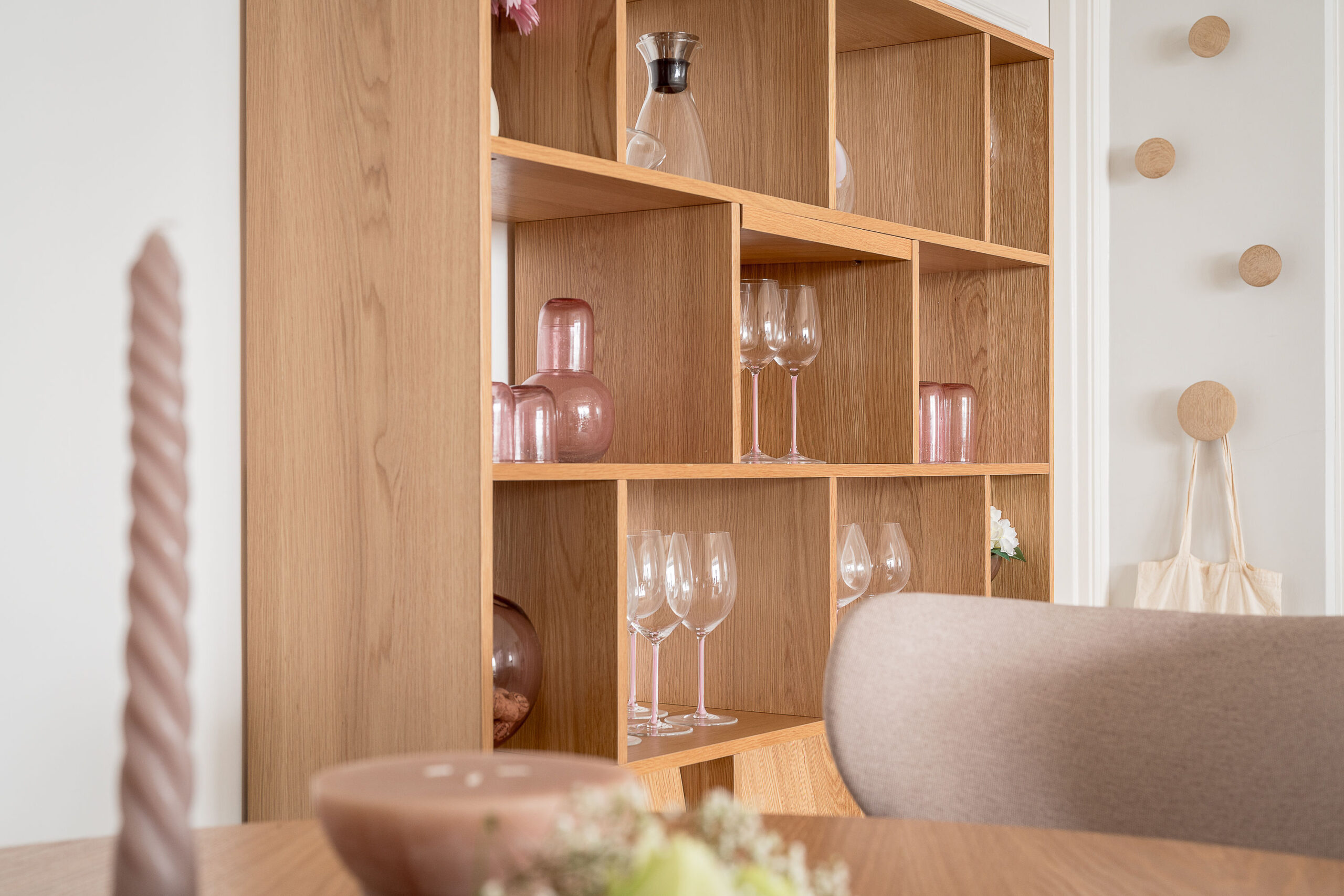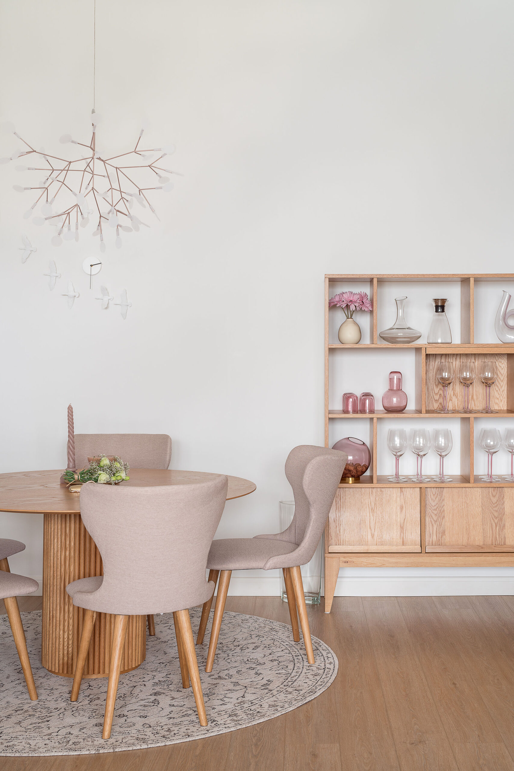 After searching high and low for the perfect wall clock, we came across a unique bird clock and found a home for it in the dining area. Next to the dining area, we chose a warm, natural cabinet to display Emily’s collection of wine glasses, a wine canister, tumblers, and flowers in hints of pink. It really brought the look together, with lots of fun personality.