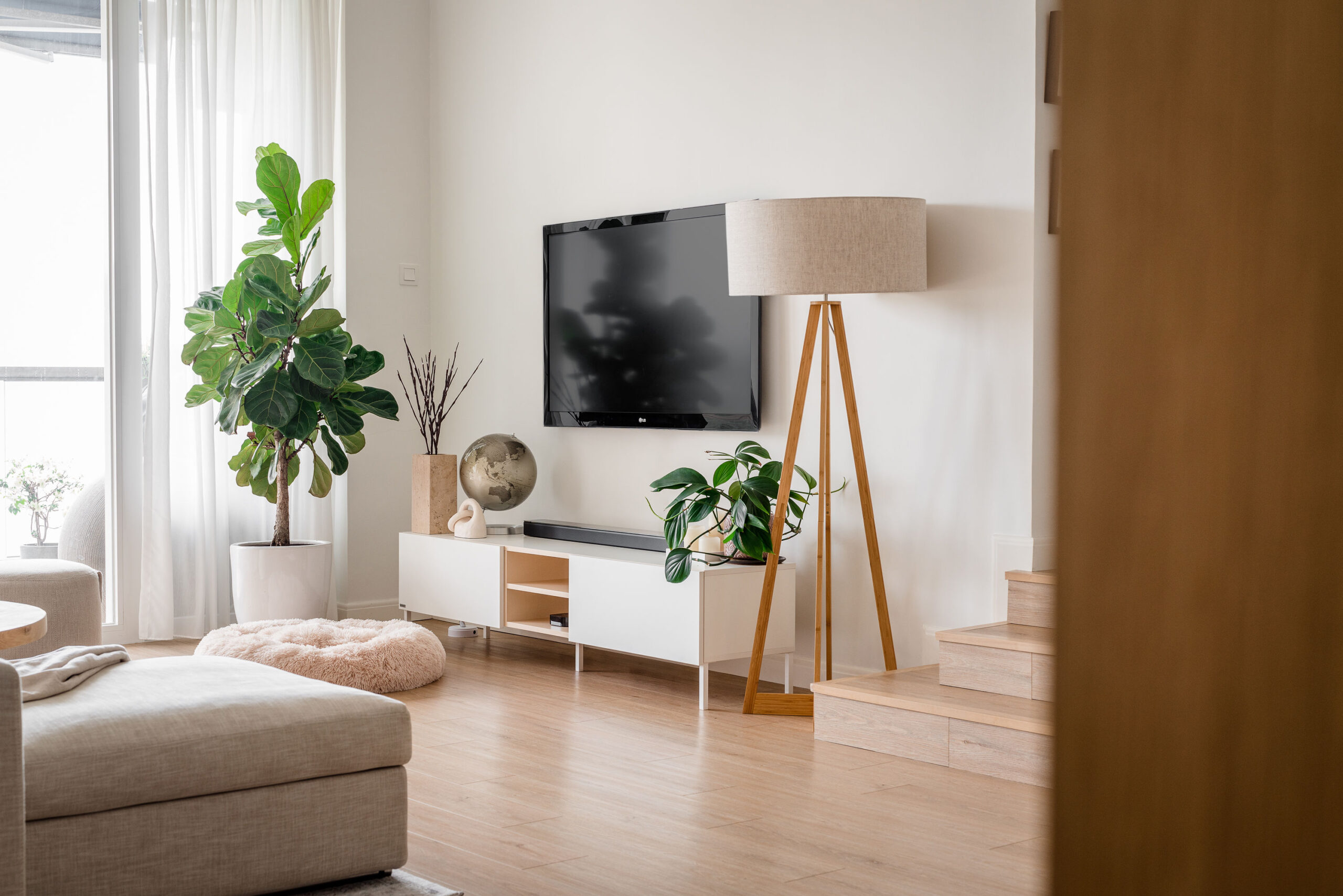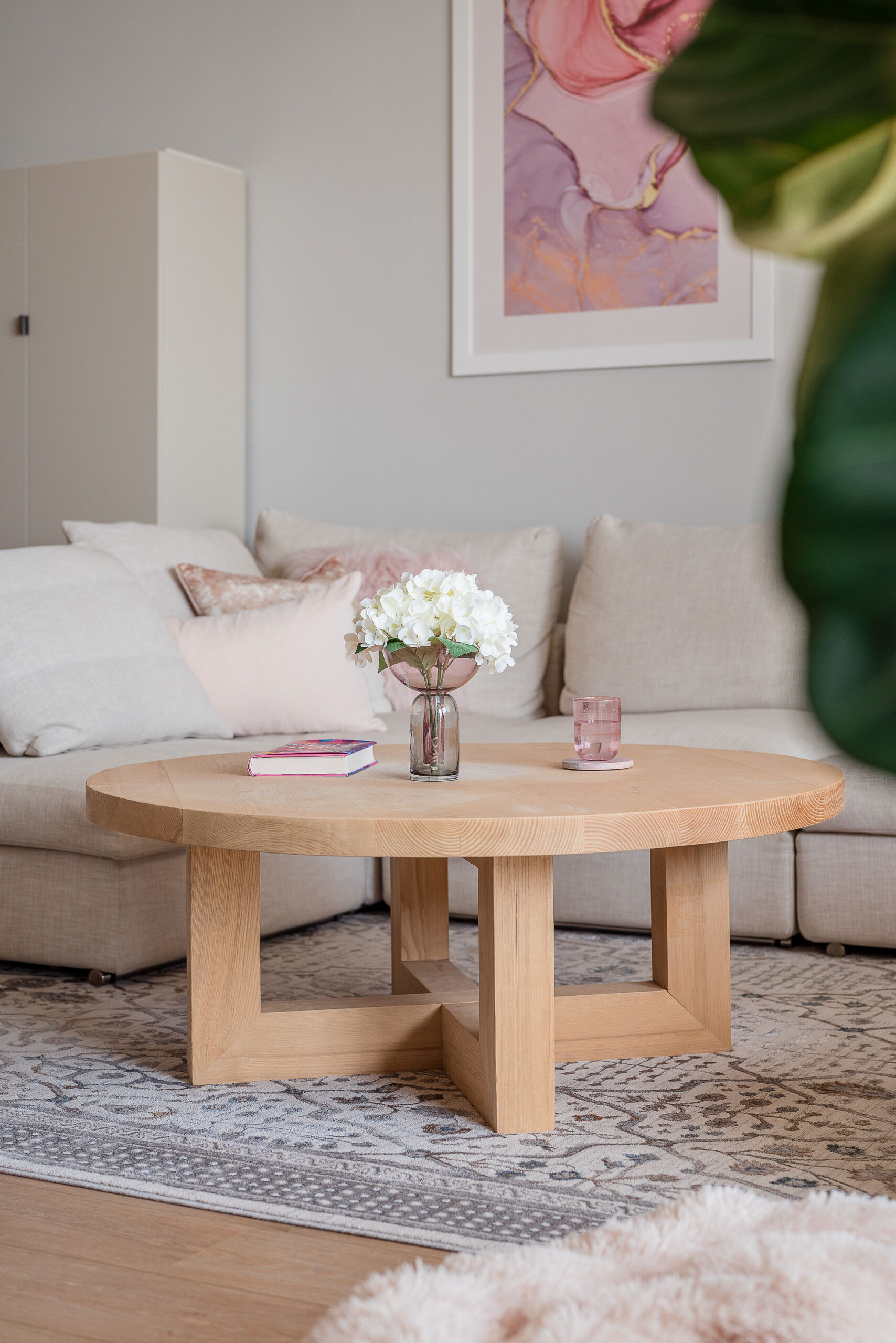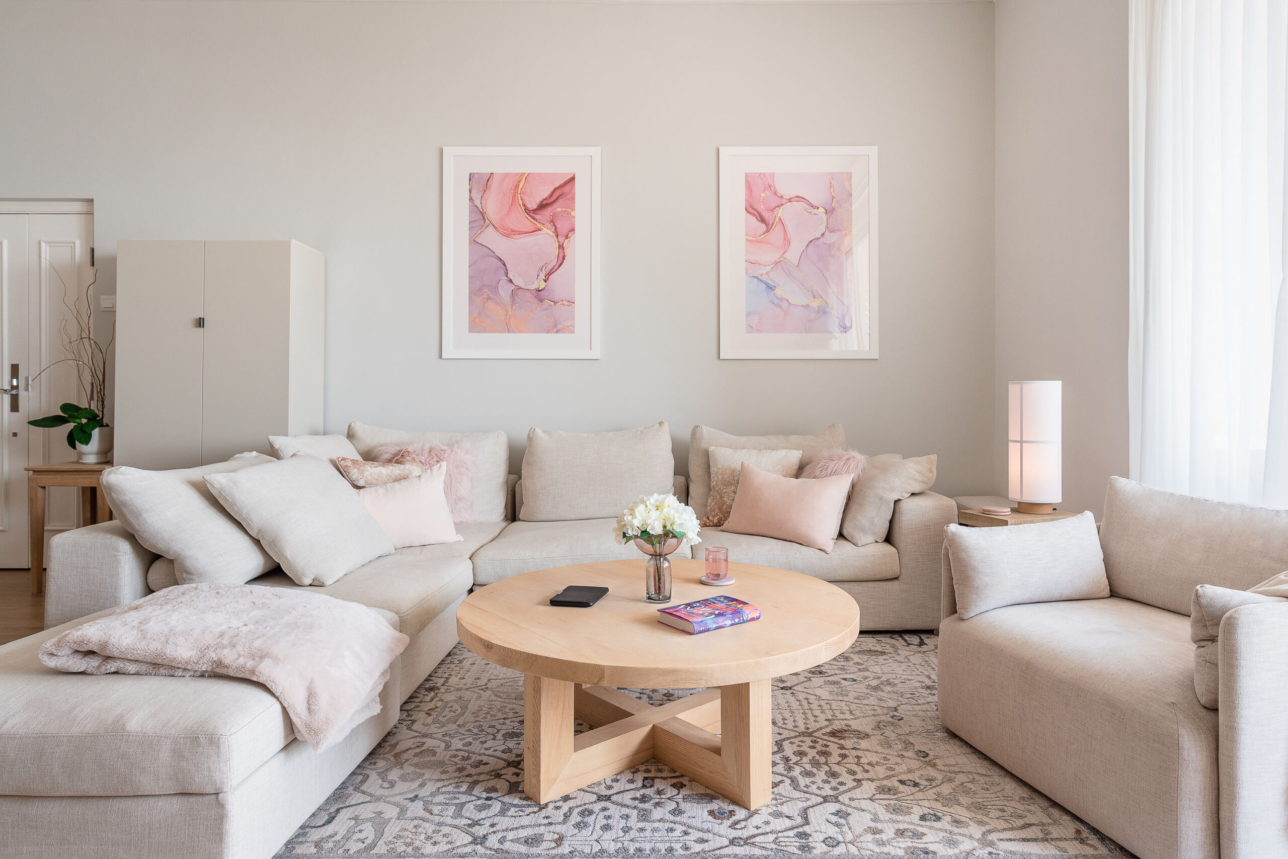 We spruced up the sofa with cream and pink textured cushions to give a warm, fuzzy feeling and placed a chic oriental rug underneath. We wanted to bring warmth to the area, so we chose a natural-wood round coffee table, hung a beachy rattan ceiling light, and added 2 pretty pink prints with marble detailing on the walls. To match the area, we went for a white TV console with light-wood accents and a gorgeous floor lamp with a neutral beige shade, and added the finishing touches of plants and Nordic-style ornaments.