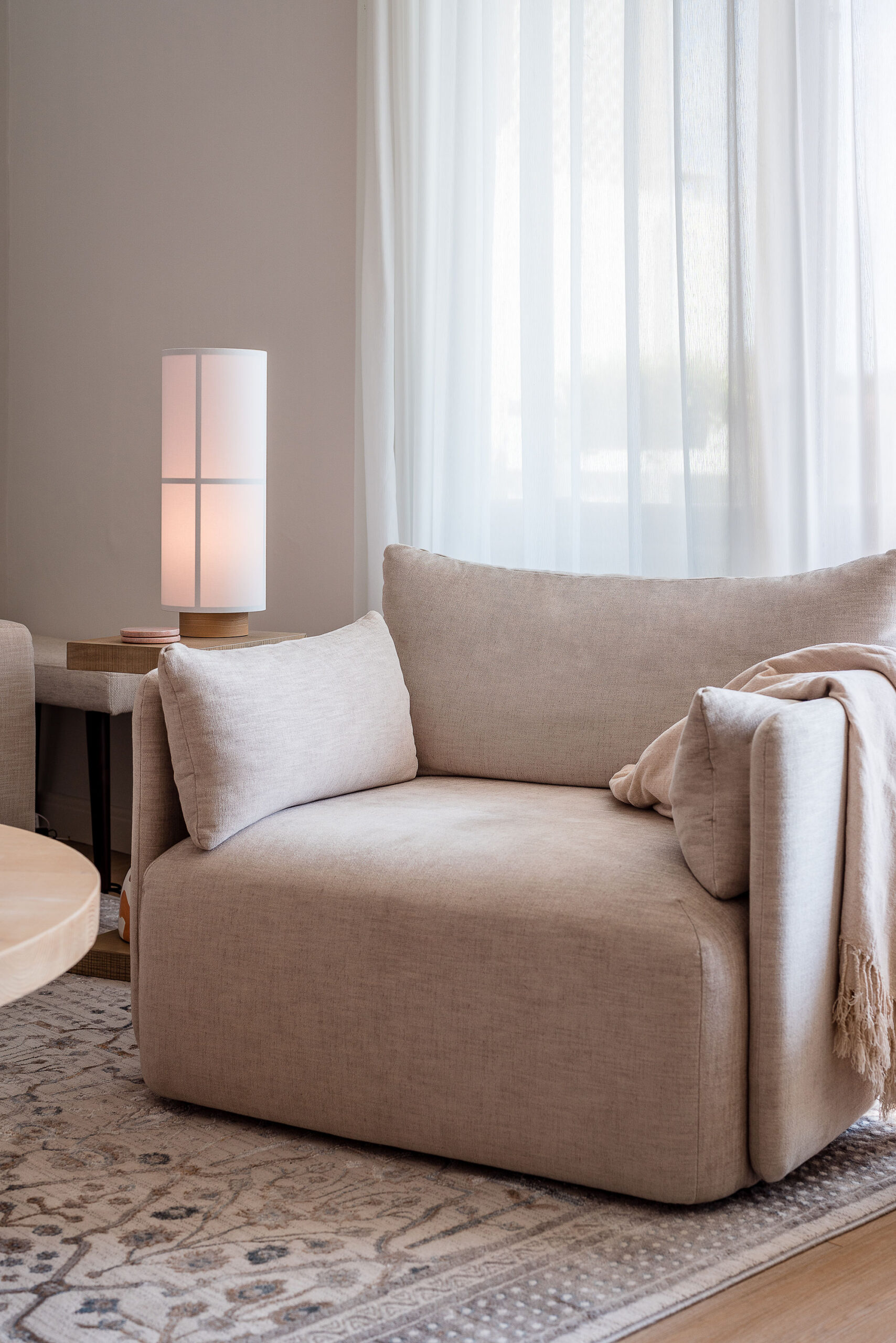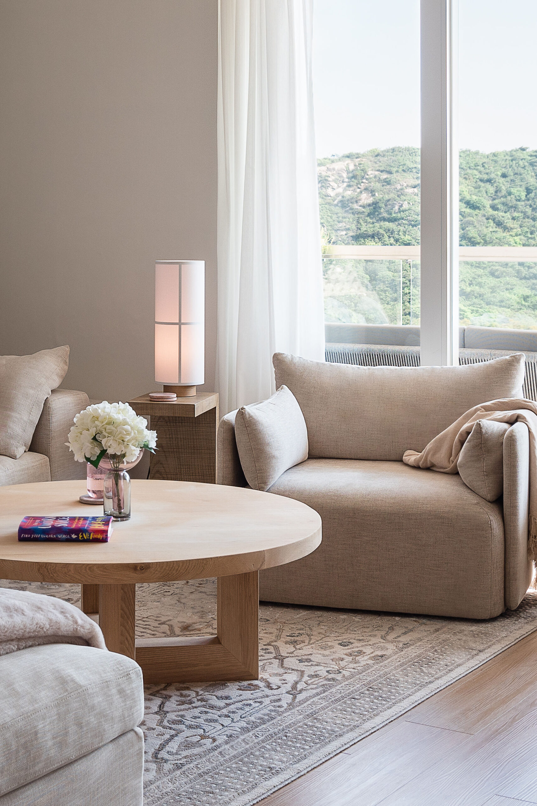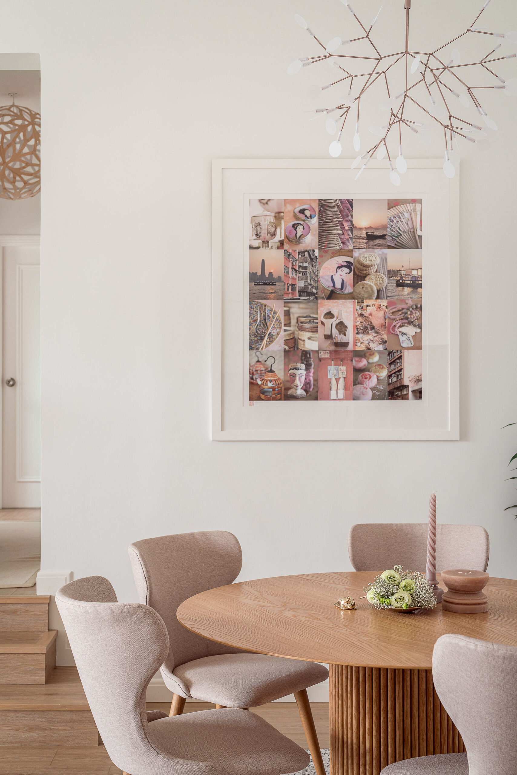 We spruced up the sofa with cream and pink textured cushions to give a warm, fuzzy feeling and placed a chic oriental rug underneath. We wanted to bring warmth to the area, so we chose a natural-wood round coffee table, hung a beachy rattan ceiling light, and added 2 pretty pink prints with marble detailing on the walls. To match the area, we went for a white TV console with light-wood accents and a gorgeous floor lamp with a neutral beige shade, and added the finishing touches of plants and Nordic-style ornaments.