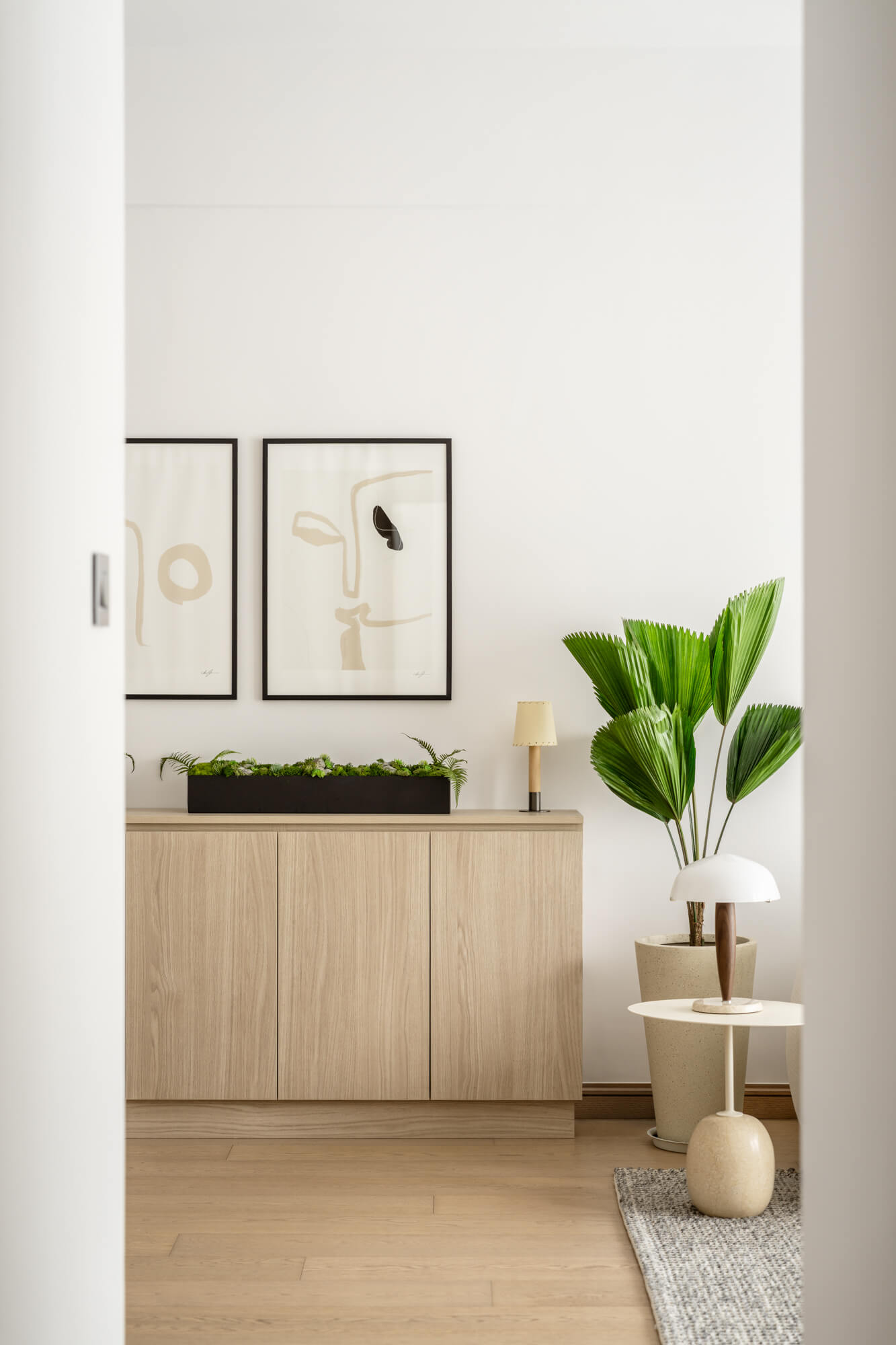 A built-in unit by the entry provides extra storage while keeping the room feeling streamlined. The overall mood is ultra serene—a true retreat that feels tucked away from the pace of city life.