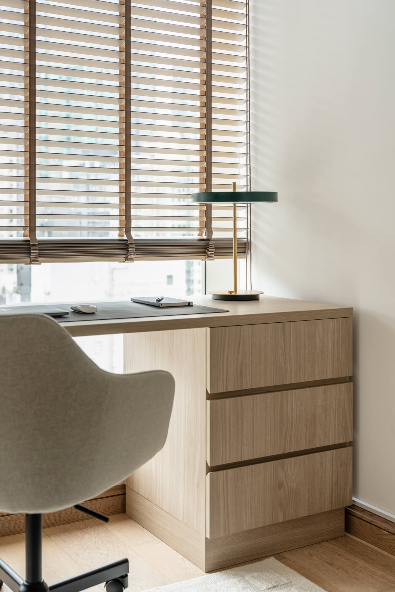 The home office leans into quiet Japandi aesthetics, with clean lines, warm woods, and a calming palette that makes working from home feel more like a choice than a chore. Full-height shelving and integrated storage keep everything tucked away and within reach, helping to maintain a clear and organised space. We added blinds for a little privacy without sacrificing sunlight, allowing the room to stay bright while feeling cocooned. The desk was positioned to take in sweeping city views, and the soft styling and greenery create a sense of ease. It’s a space that feels elevated and serene, designed for deep focus without visual noise.