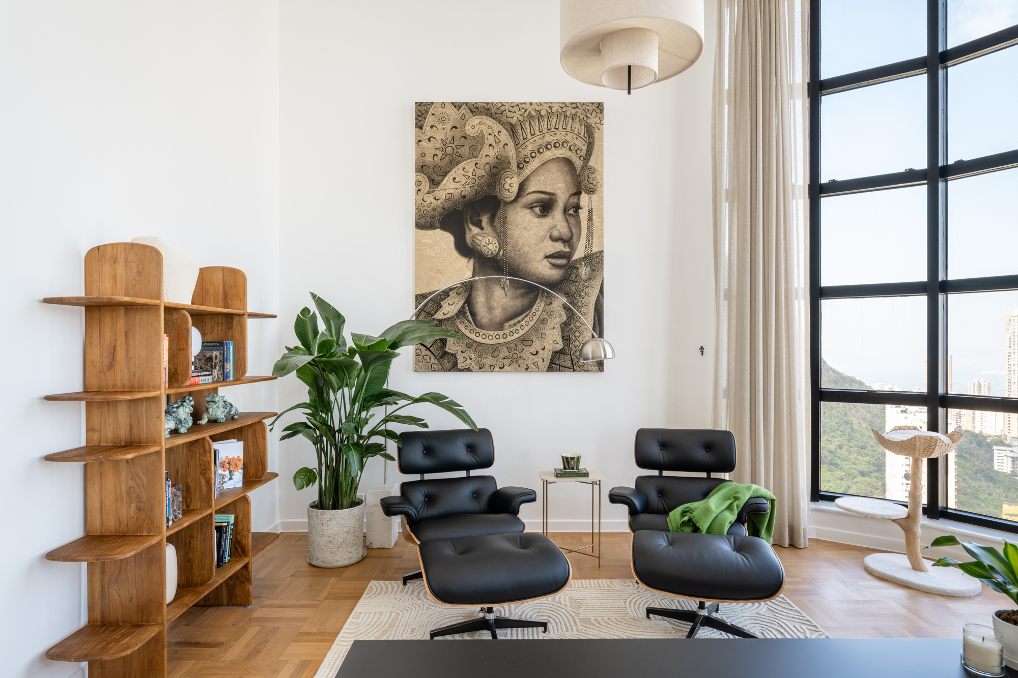Moving homes rarely involves starting from scratch, and in this case, Lena already had a collection of beautiful pieces she loved, from her dining table and sofa to armchairs and artwork that carried memories from her previous space. The challenge was making these familiar elements feel at home in a completely new setting. This wasn’t our first time doing some rental-friendly home styling in Queen’s Garden in Central! We’ve styled other duplexes in the same building before and always look forward to the sweeping city views and clever layout, where the living and dining areas overlook the skyline.