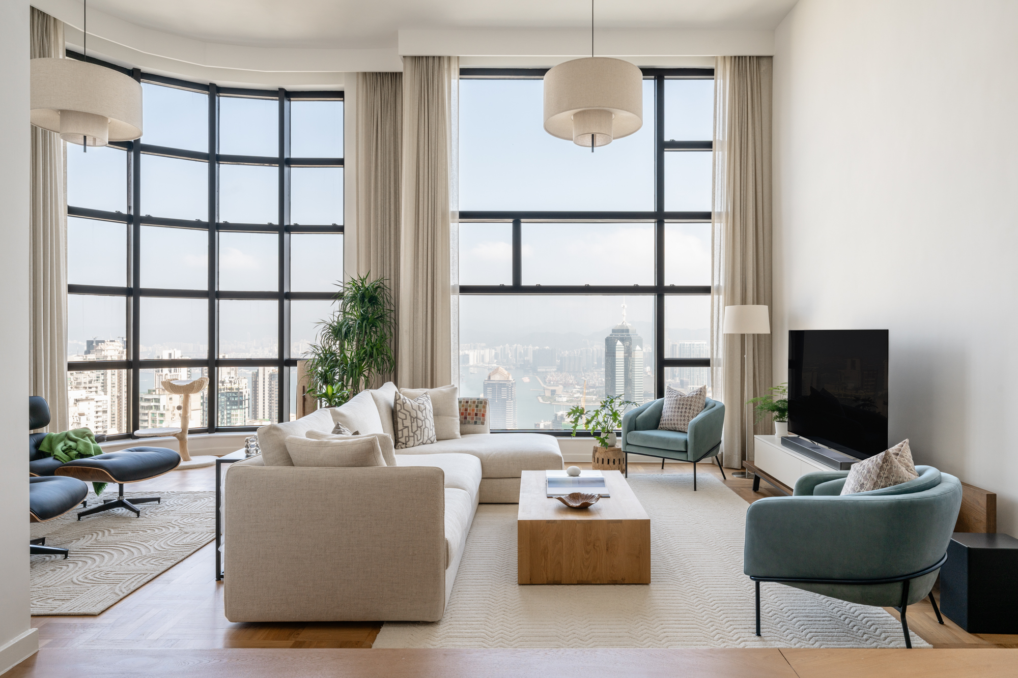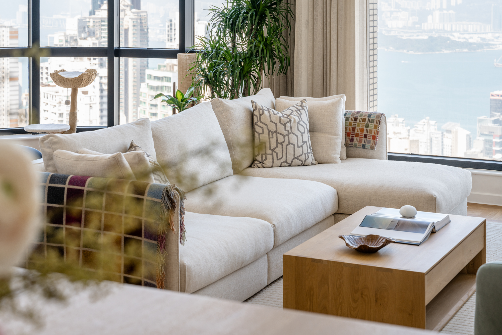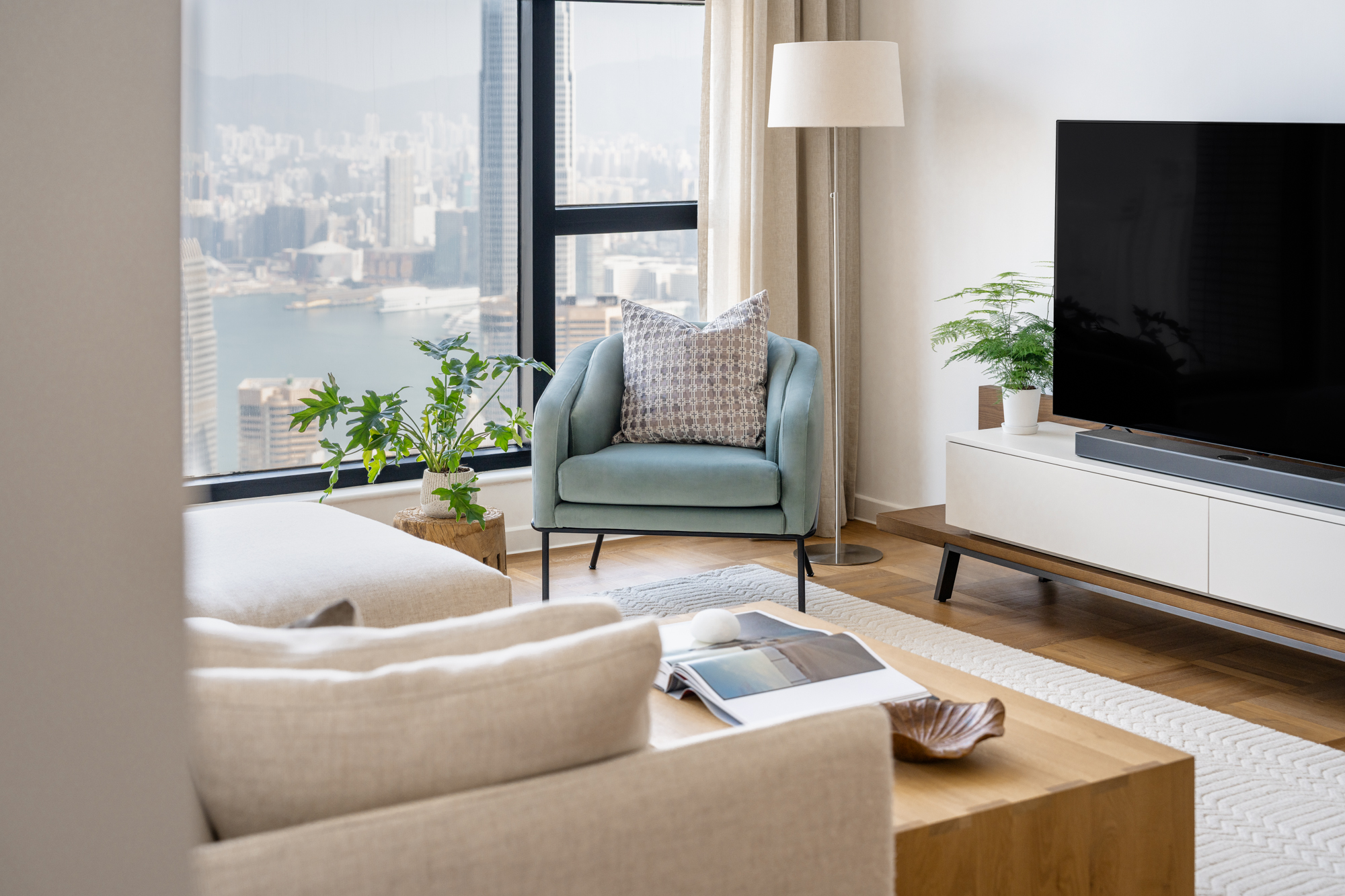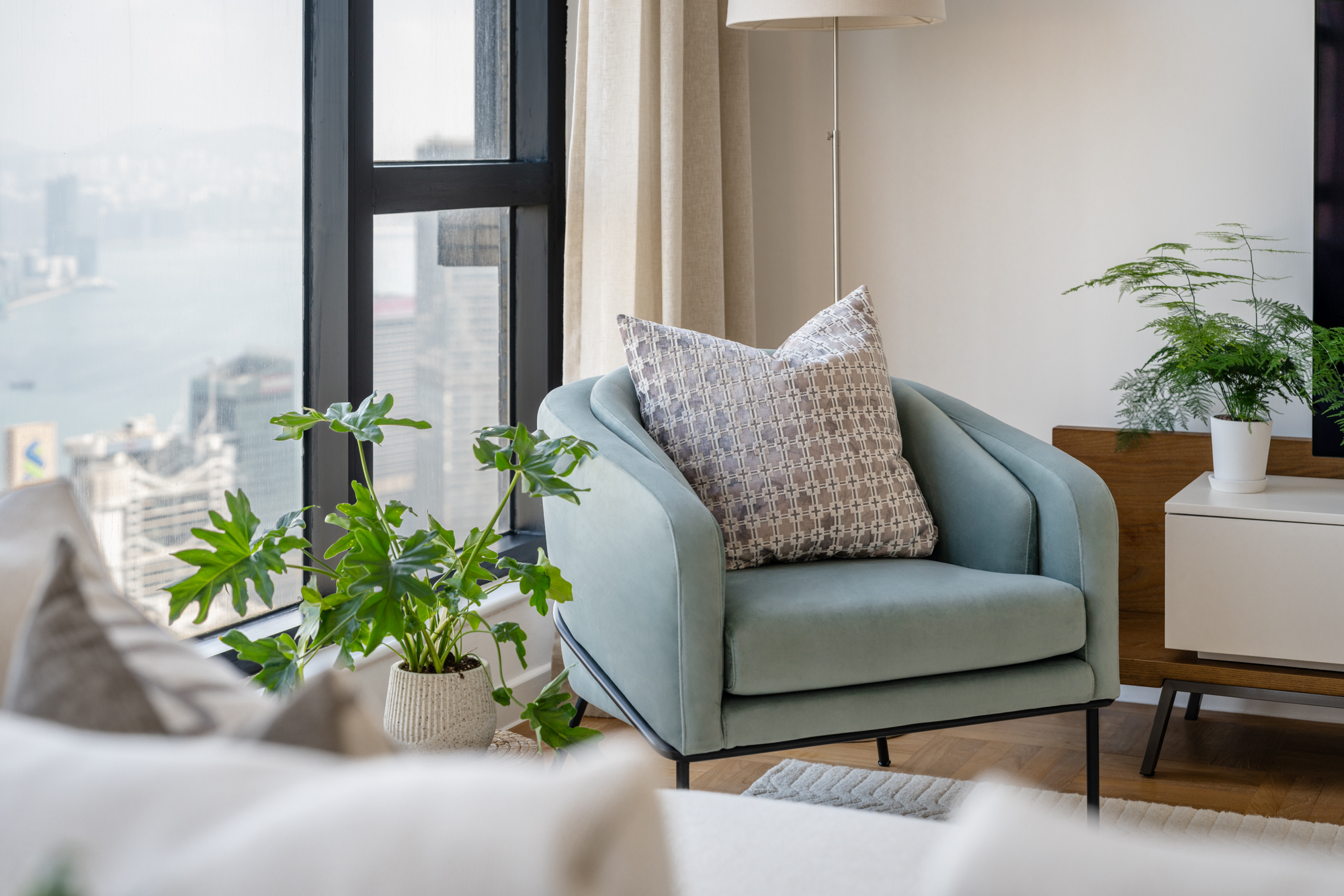 Moving homes rarely involves starting from scratch, and in this case, Lena already had a collection of beautiful pieces she loved, from her dining table and sofa to armchairs and artwork that carried memories from her previous space. The challenge was making these familiar elements feel at home in a completely new setting. This wasn’t our first time doing some rental-friendly home styling in Queen’s Garden in Central! We’ve styled other duplexes in the same building before and always look forward to the sweeping city views and clever layout, where the living and dining areas overlook the skyline.