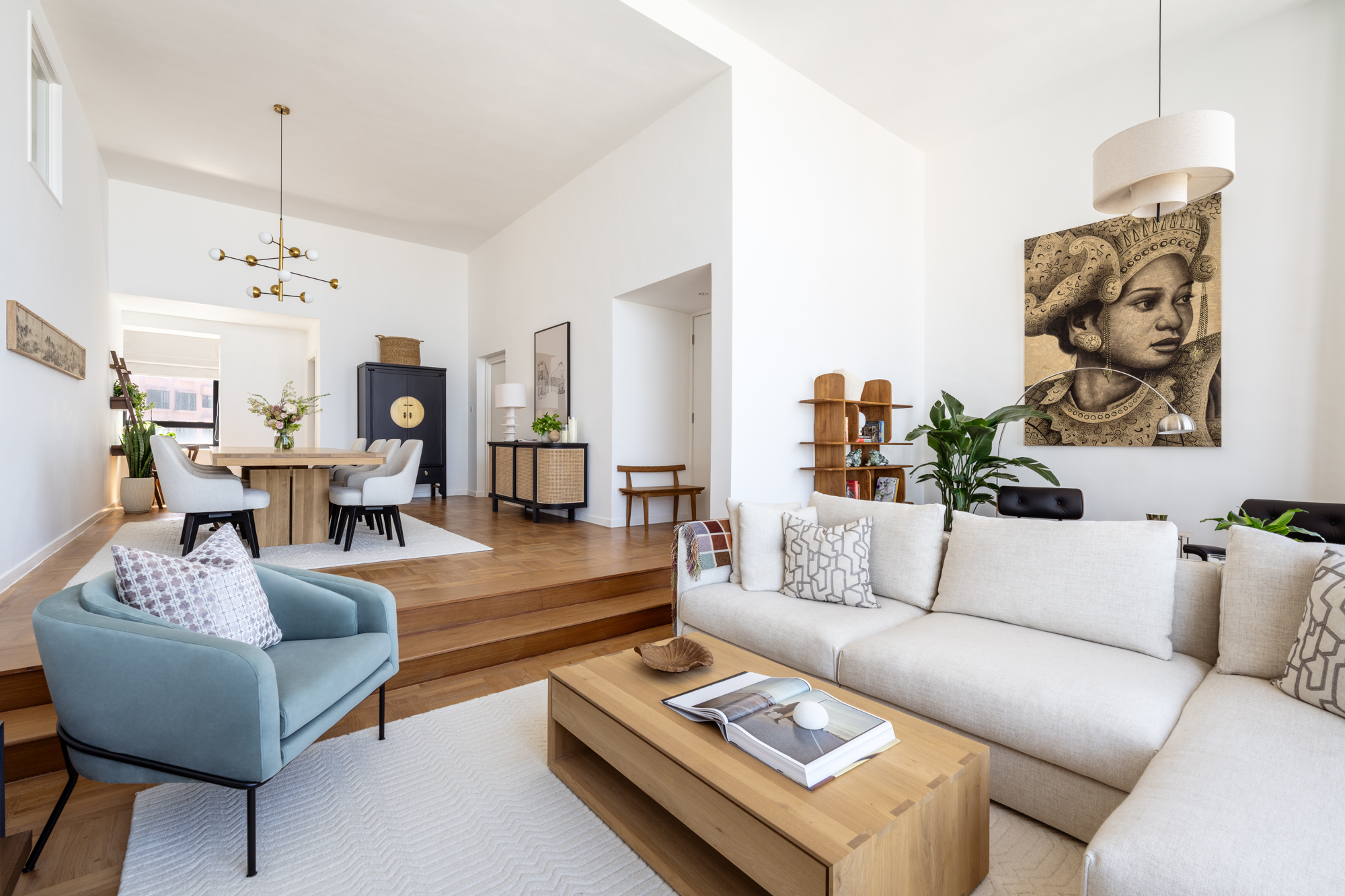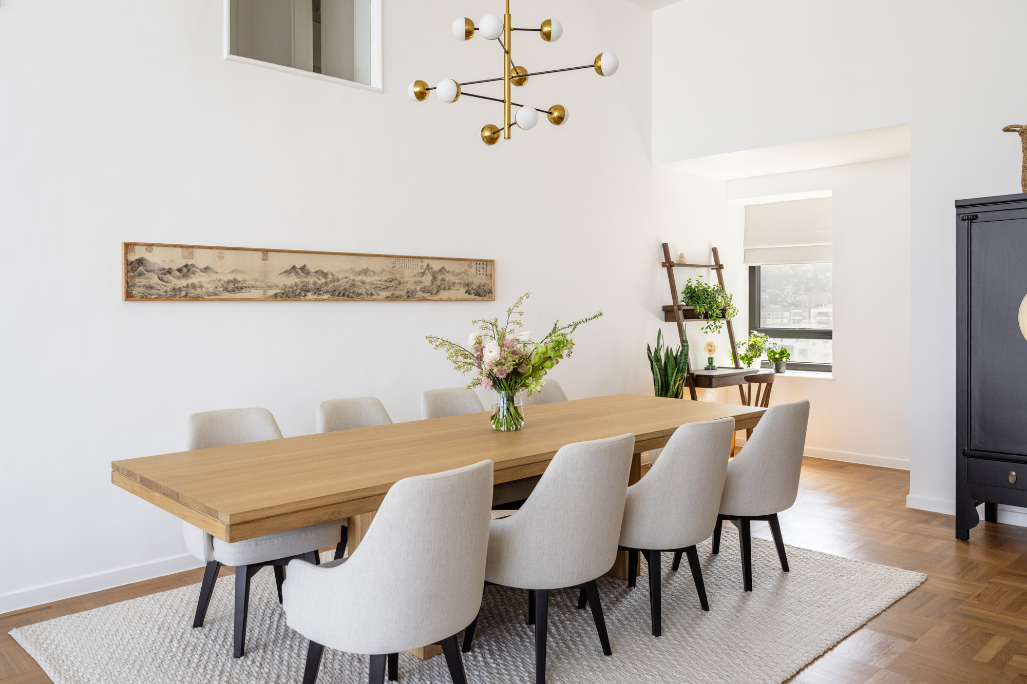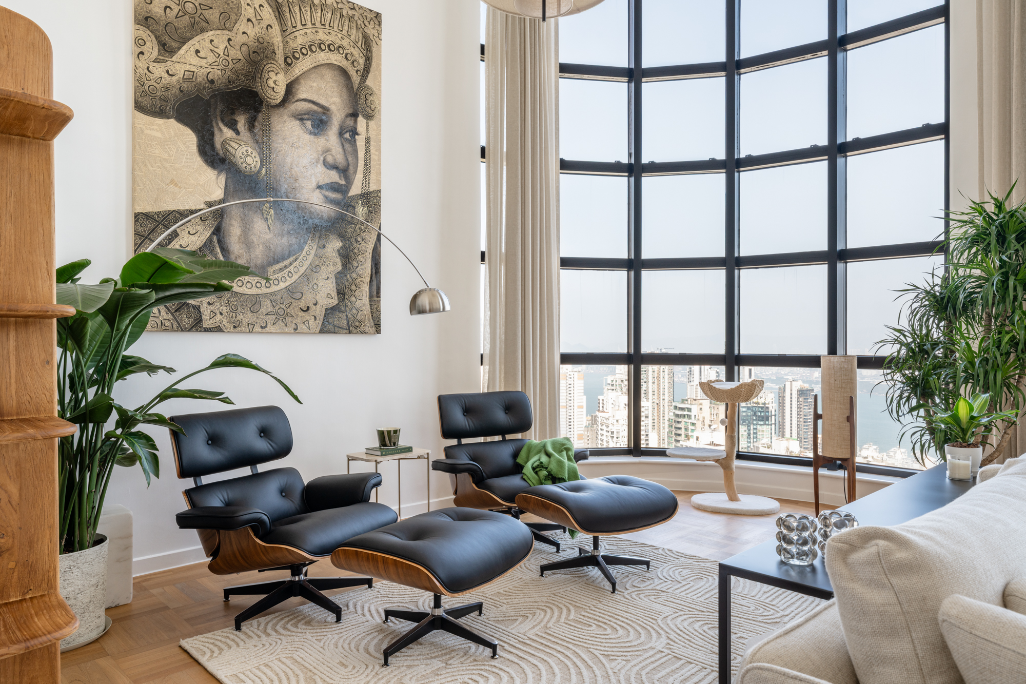 Moving homes rarely involves starting from scratch, and in this case, Lena already had a collection of beautiful pieces she loved, from her dining table and sofa to armchairs and artwork that carried memories from her previous space. The challenge was making these familiar elements feel at home in a completely new setting. This wasn’t our first time doing some rental-friendly home styling in Queen’s Garden in Central! We’ve styled other duplexes in the same building before and always look forward to the sweeping city views and clever layout, where the living and dining areas overlook the skyline.