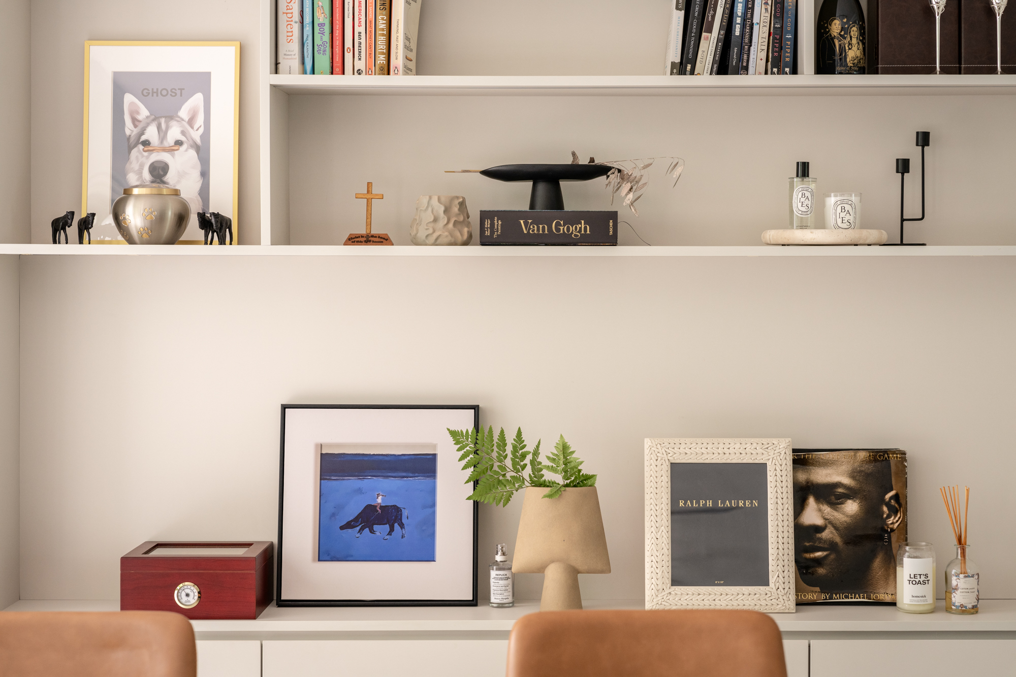 We anchored this dual-purpose room with their favourite shade of navy blue, using a curved sofa to define two zones within the shared space. The result? A room that perfectly balances work, play, and relaxation. Behind the couch sits a functional desk space and wall-to-wall shelving for keepsakes. This combination of style and purpose makes it easy for the client to transition from work mode to relaxation without ever leaving the room.