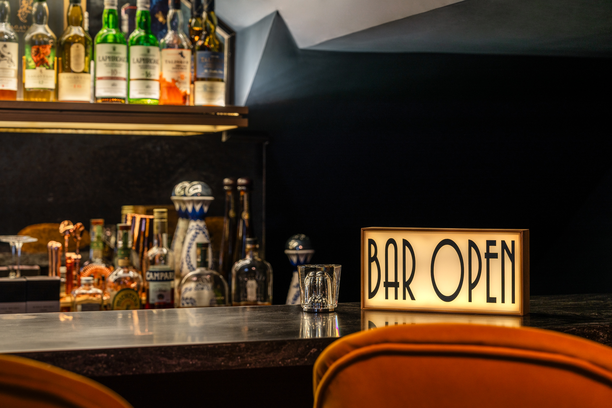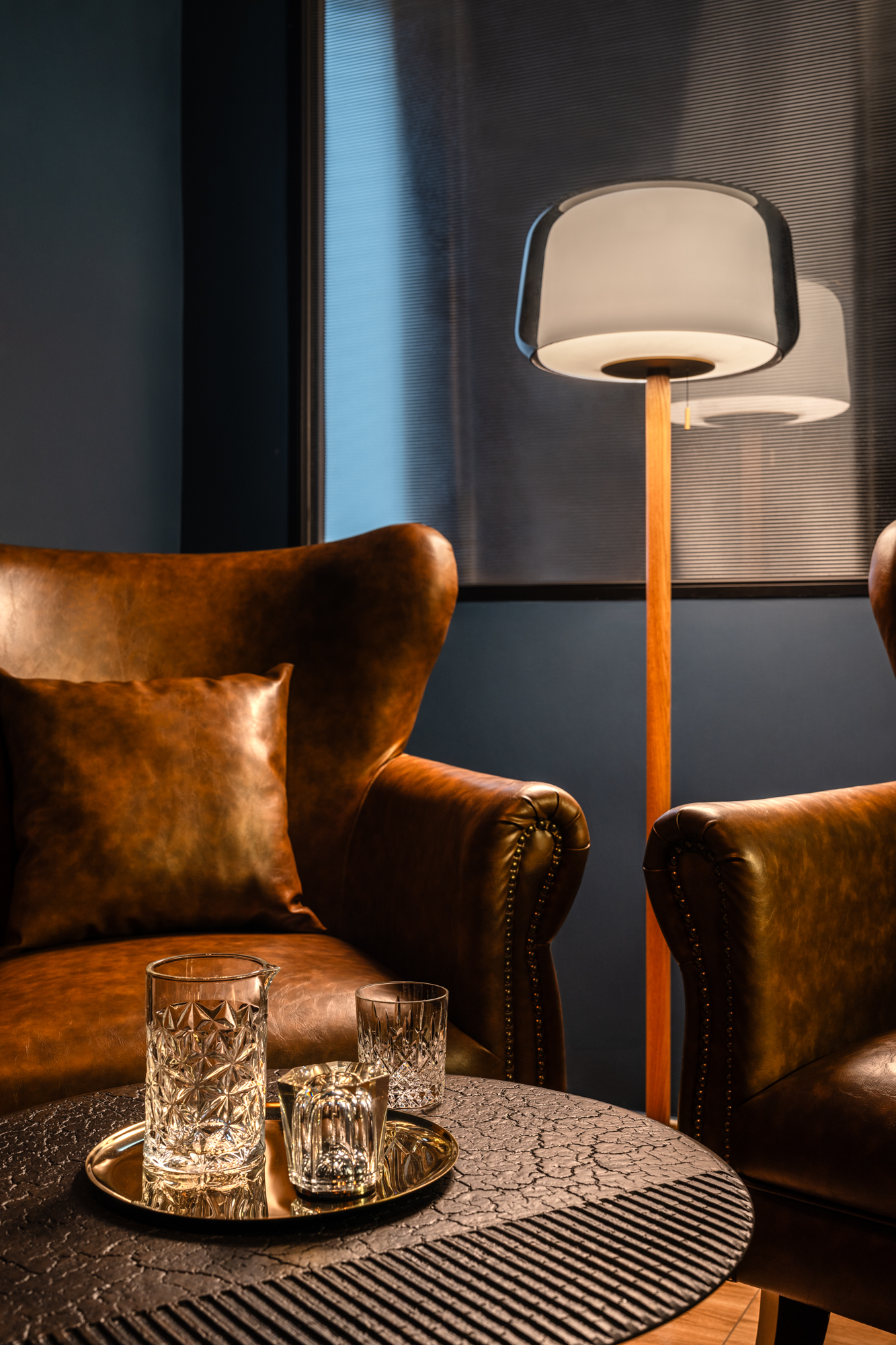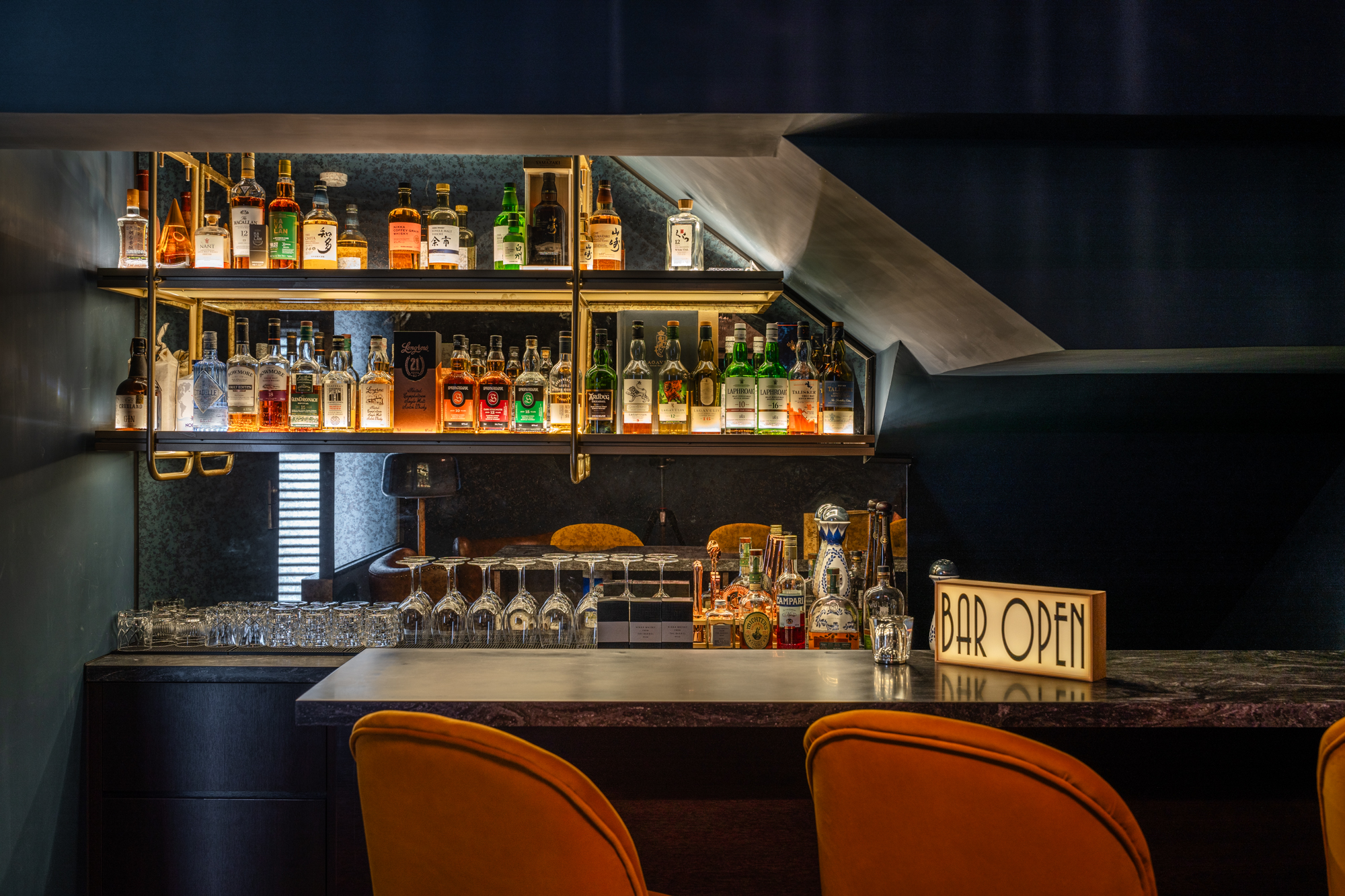 We anchored this dual-purpose room with their favourite shade of navy blue, using a curved sofa to define two zones within the shared space. The result? A room that perfectly balances work, play, and relaxation. Behind the couch sits a functional desk space and wall-to-wall shelving for keepsakes. This combination of style and purpose makes it easy for the client to transition from work mode to relaxation without ever leaving the room.