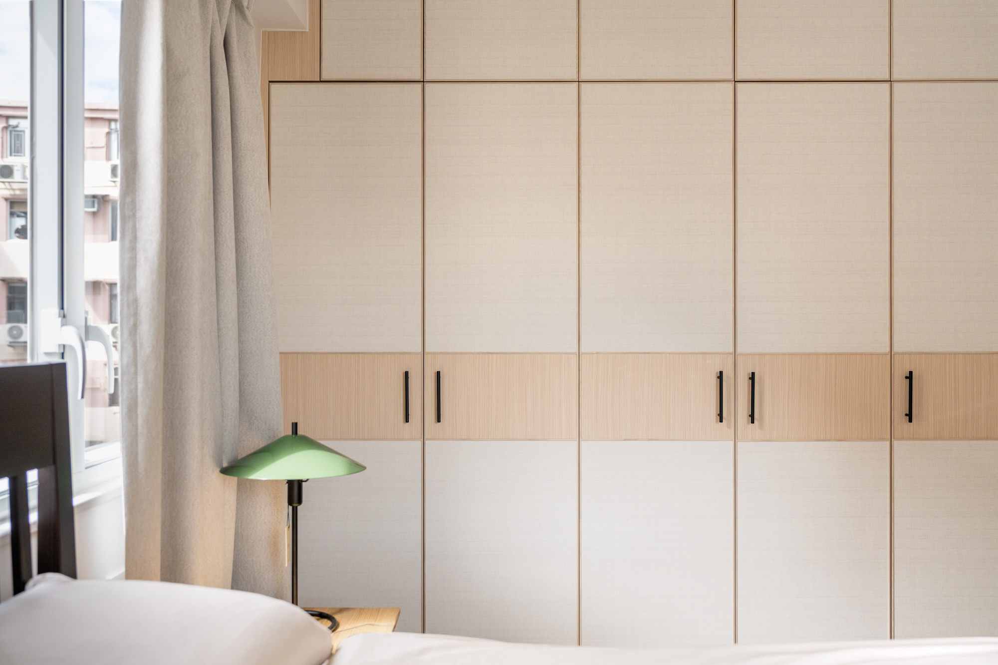 The guest room was designed to be adaptable, functioning as both a comfortable lounge, closet space and a sleeping space when needed. A sofa with a pull-out bed allows the room to transition easily, while built-in cabinetry maximises storage without adding visual weight.