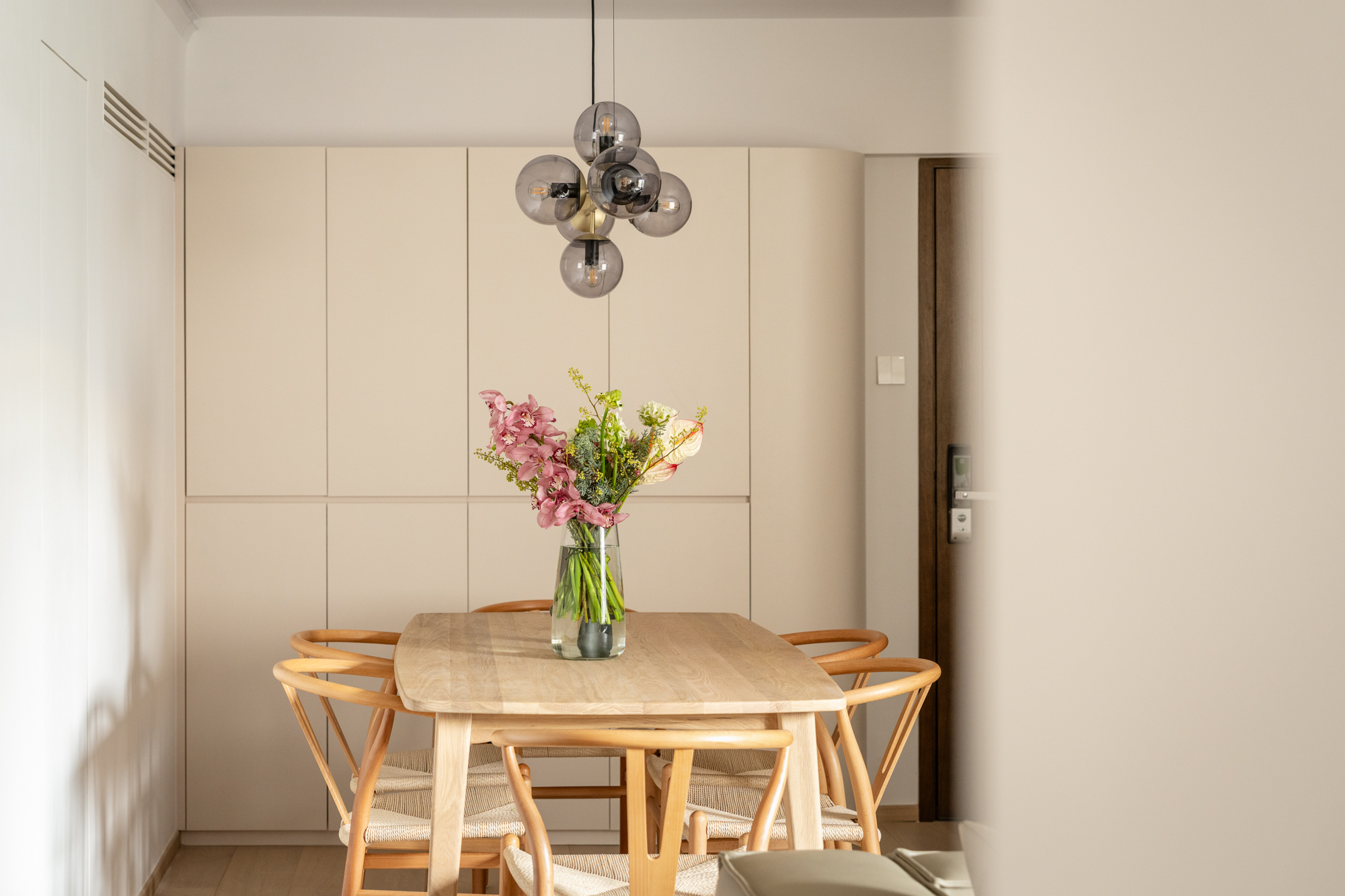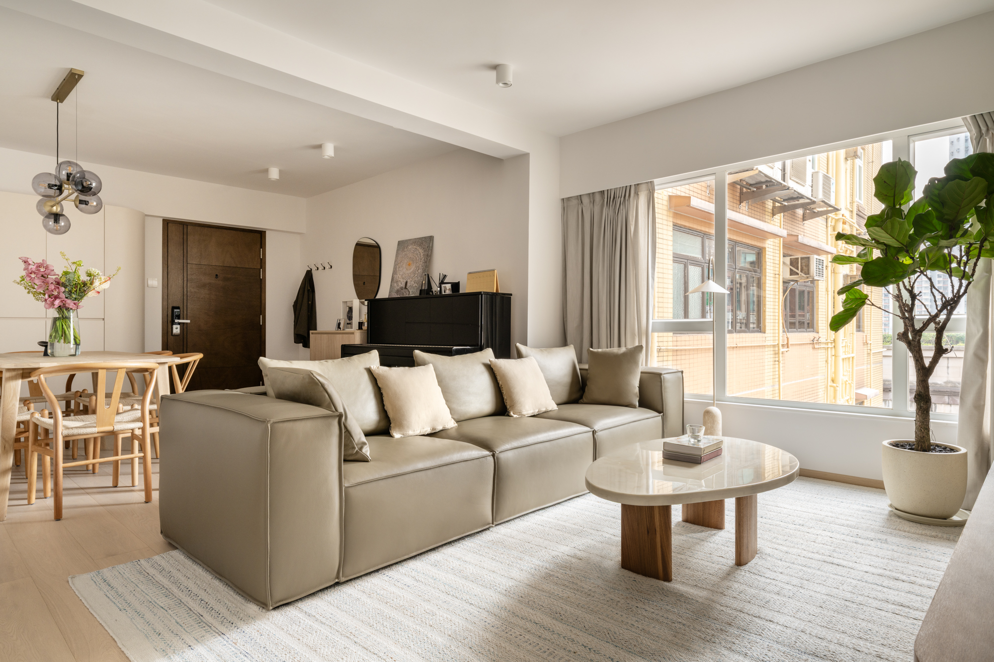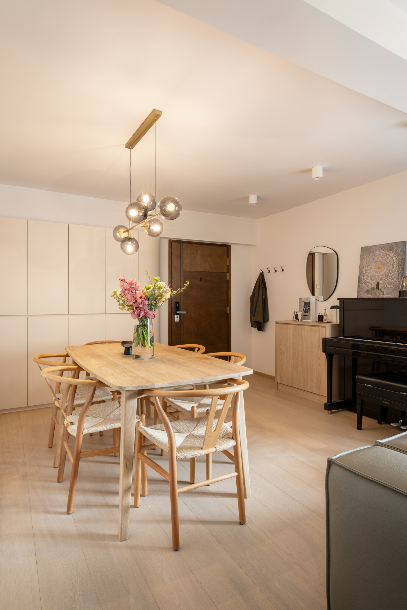 The entrance opens into a combined living and dining area designed to feel open. To accommodate the piano without overwhelming the space, we focused on maintaining clear sightlines and a calm palette that allows the room to breathe.