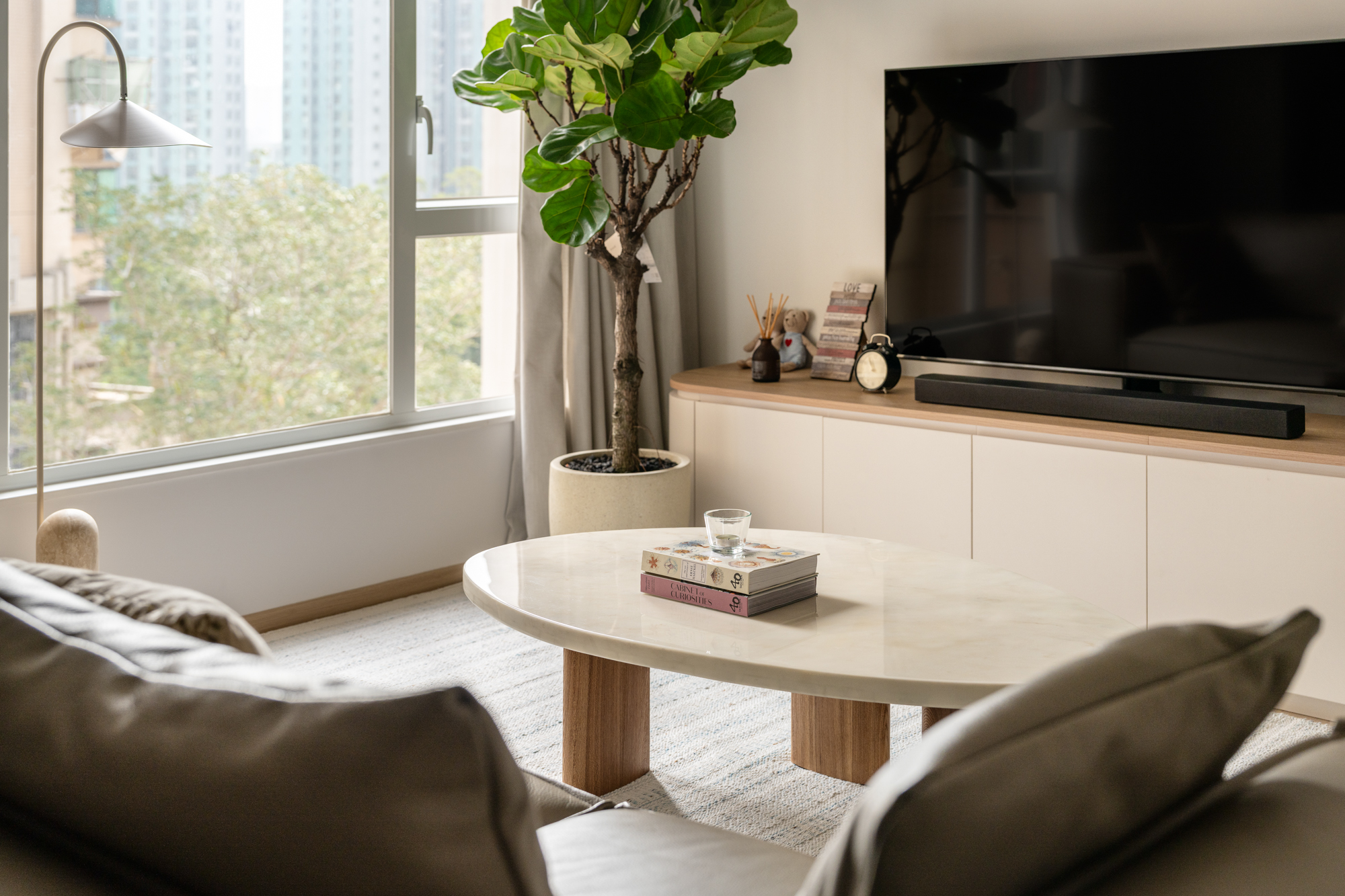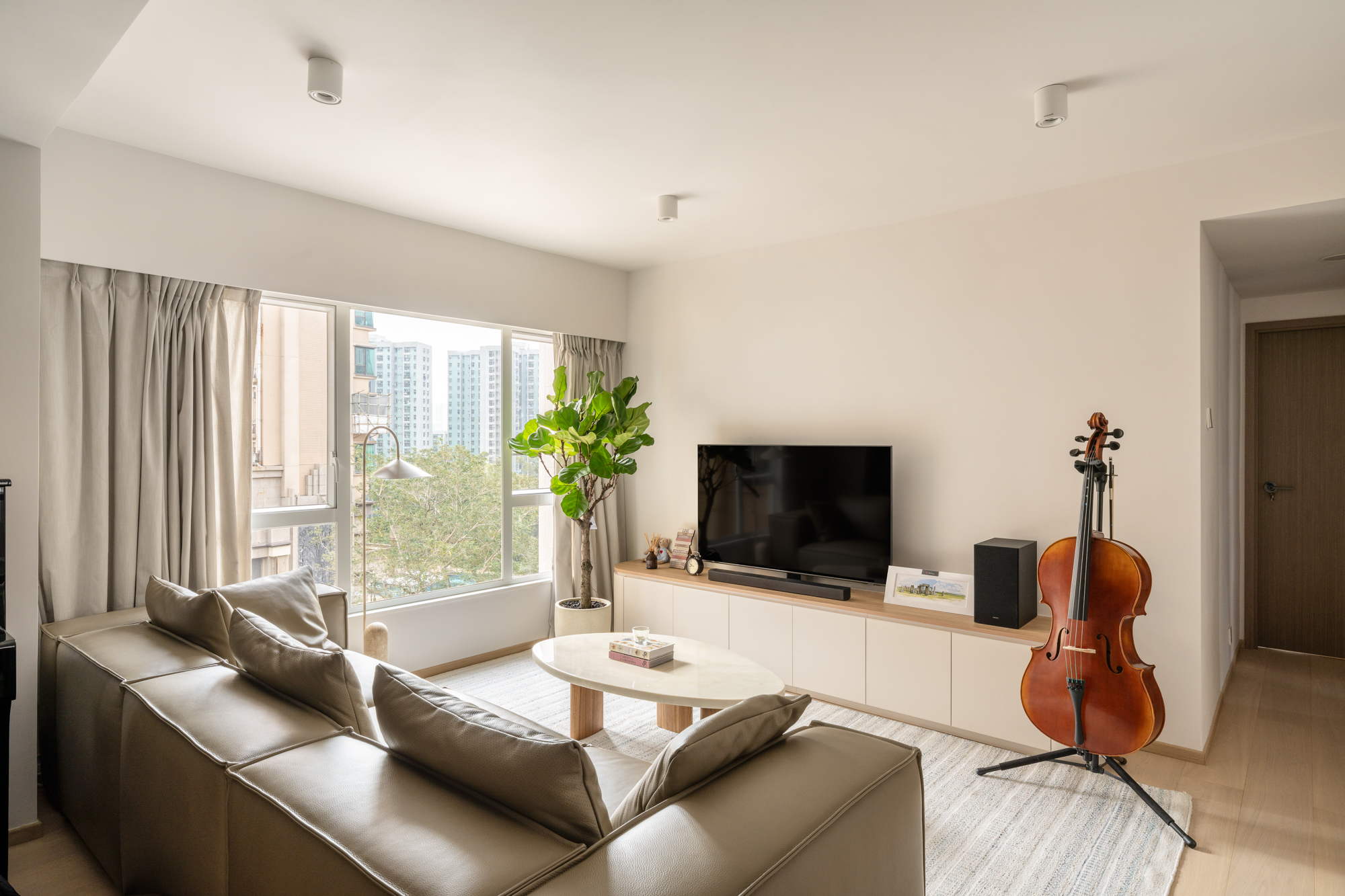 Curved built-in cabinetry softens the architecture and improves flow, echoed by a rounded coffee table and gently contoured TV console. Cream tones keep the space bright, while sheer curtains diffuse sunlight and provide privacy without darkening the room. Space was also reserved for a cello, reinforcing the room’s role as both a living area and a creative space.