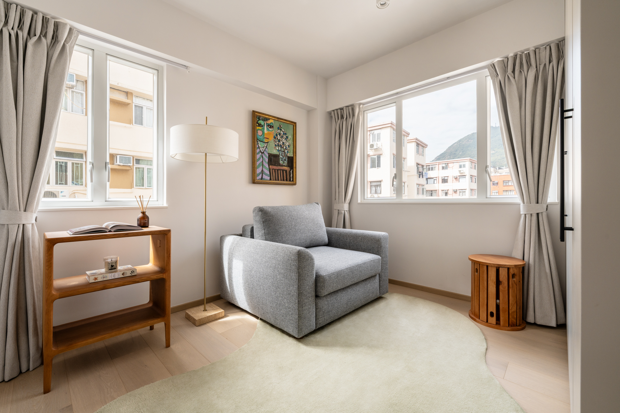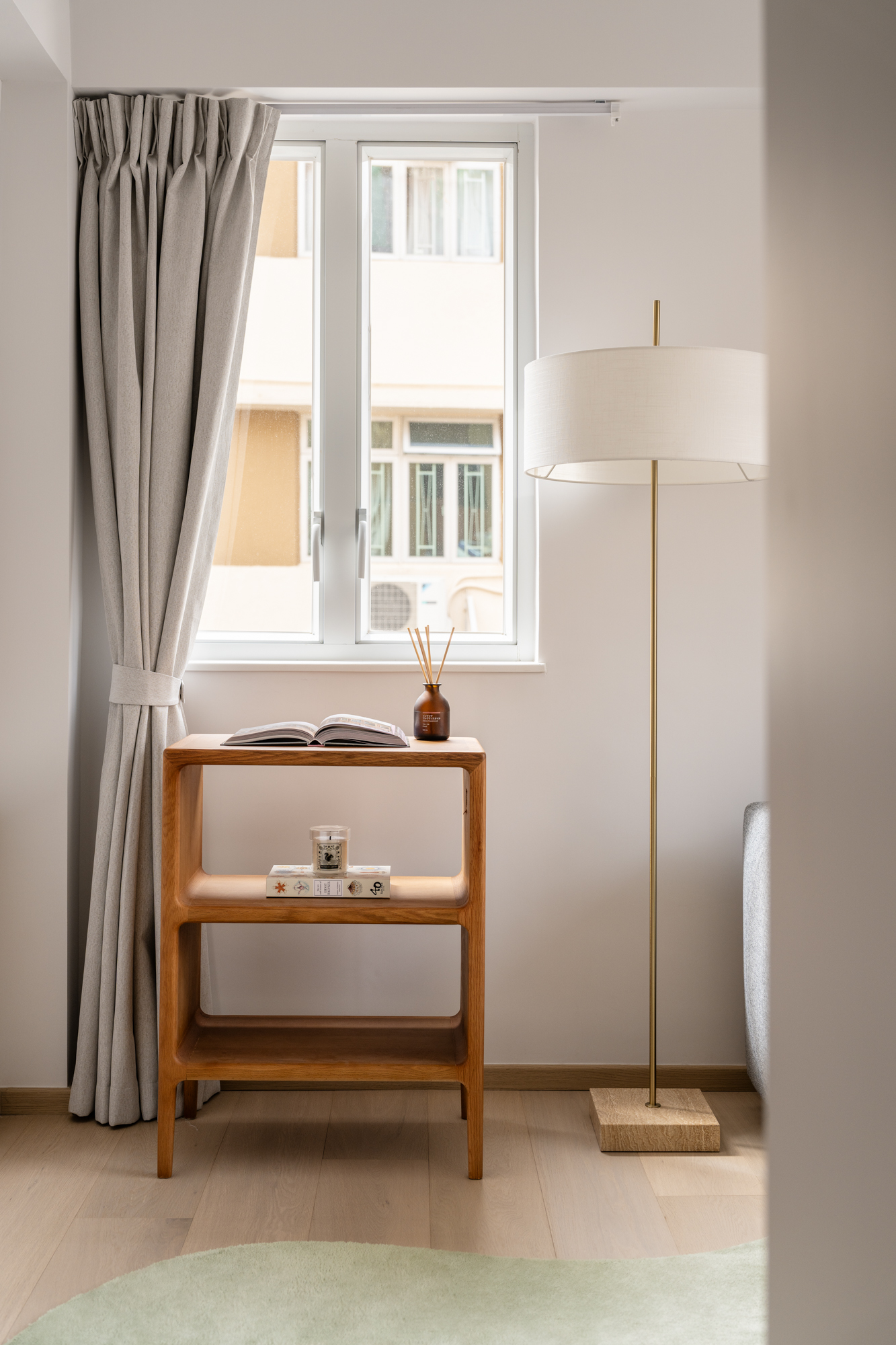 A low open-side table and a minimalist floor lamp keep the space practical yet uncluttered. The overall feel is warm, simple, and welcoming, ready for visitors while remaining useful day to day.