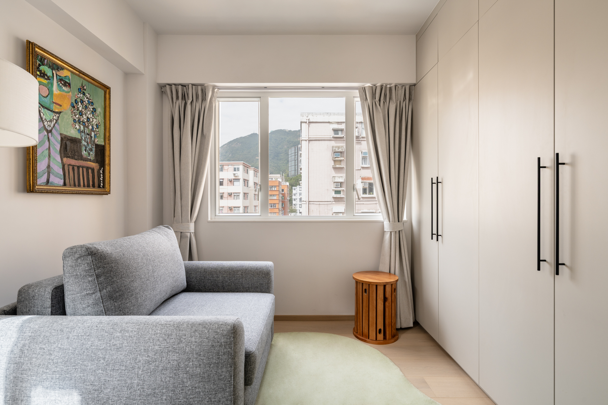 The guest room was designed to be adaptable, functioning as both a comfortable lounge, closet space and a sleeping space when needed. A sofa with a pull-out bed allows the room to transition easily, while built-in cabinetry maximises storage without adding visual weight.