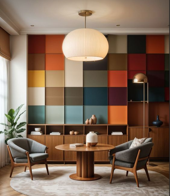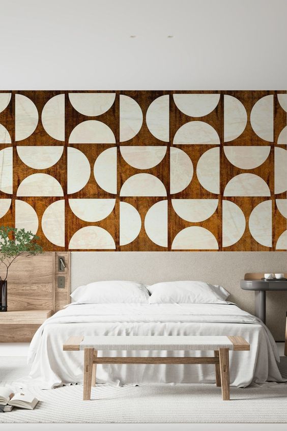 Strategically placing these patterned elements can enhance the room’s dimensions and add a dynamic touch to your mid-century modern decor.
